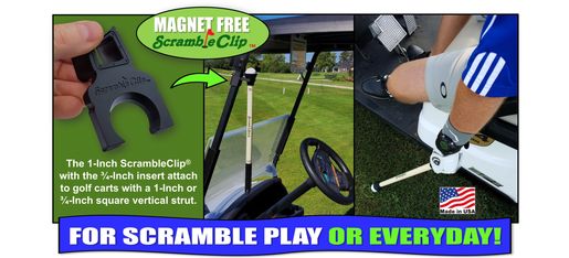 ScrambleClip® is a patent pending ball retriever holder that is designed to safely hold a ScrambleStick® onto a 1-Inch or 3/4-Inch vertical golf cart strut. It also works with many of our competitor's golf ball pick-up stick devices. Best of all, it works without magnets or spring clamps.
